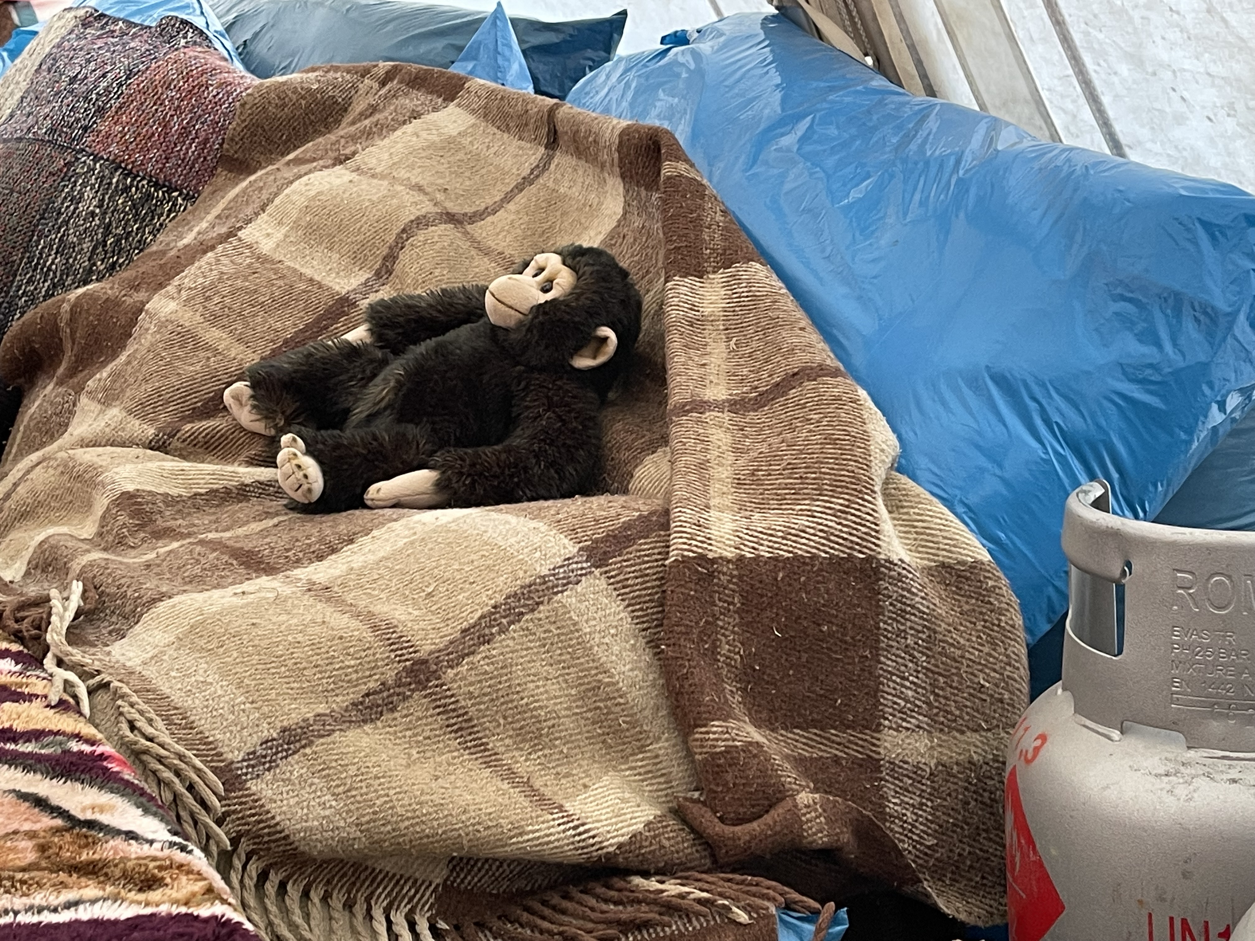 We start walking her down the road, mainly to keep ourselves from starting to cry with her. We take her on the tour of the “Golden Triangle”: hot soup; heated tent; local SIM card and Wi-Fi. The kid gets a treat, a toy, a piece of fruit brought over every minute: the Israeli tent, the Maltese tent, the Spaniards, the Romanians, the Greeks.